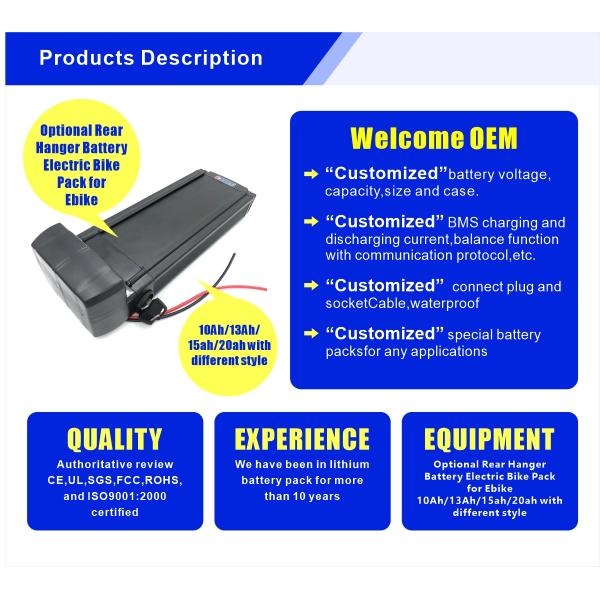 Factory Black Optional Rear Hanger Lithium Battery Pack 36V 10Ah 13Ah 15ah Battery for E bike