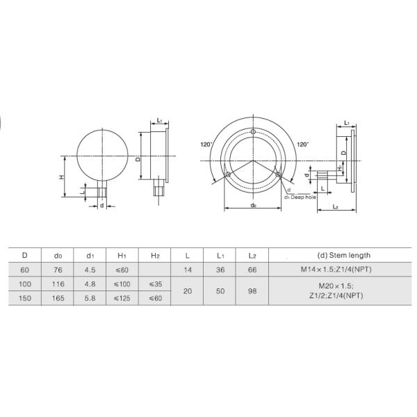 Stainless steel pressure gauge | 0-0.1,0.16,0.25,0.4,0.6,1, 1.6,2.5,4.6,10,16,25,40,60, -0.1-0,0.06,0.15,0.3,0.5, 0.9,1.5,2.4 | 2.5 or 1.6 |