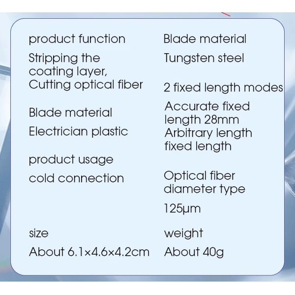| Product function: | Stripping the coating layer, cutting the optical fibre |