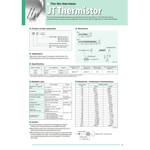 The JT series thermistor features a thickness of less than 500 μm and can be installed in spaces as thin as a credit card. The JT thermistors also have excellent electrical insulation and can be safely used in environments where they might come in contact with electrodes.SEMITEC’S JT thermistors are fully compliant with RoHS DIRECTIVE2011/65/EU.