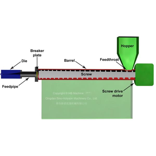 This process starts by feeding plastic material (pellets, granules, flakes or powders) from a hopper into the barrel of the extruder. The material is gradually melted by the mechanical energy generated by turning screws and by heaters arranged along the barrel. The melten polymer is then forced into a die, which shapes the polymer into a pipe that hardens during cooling.