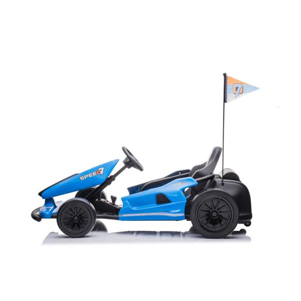 Function | 1. Front wheel: PU soft wheels; 2. Rear drift wheels for 180-360 degree drift; 3. Rear PU wheels optional, much comfortable; 4. Music+lighting+Audio optional for fun; 5. Front collision beam; 6. High&low speed shift, drift mode swtich; 7. High strength steel frame for safety support; 8. High performace silent motor wth big power; 9. Racing car seat & safety belt design; 10. Easy steer control steer whee with height adjustable function; 11. Special pedal braking function; 12. Easy pulling assisting rear extra wheels; 13. High quality racing car style leather seat; 14. Specal design racing car flag. |