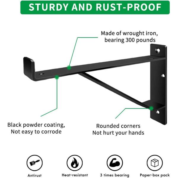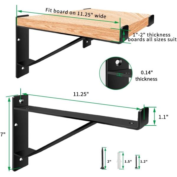 Heavy Duty Metal Size: 5mm Thickness 1.5" Wide x 5mm Thick & 0.75/1" Lip on the front. Weight Limit: our wall mounted shelf brackets can hold upwards of 70+lbs,Heavy and large size bracket Color:Black Powder Coated. Coat: anti-rust Black Powder Coated Finish Apply this on a variety of wood shelving included Kitchen shelf,bathrooms living rooms kitchens bed rooms Shelf Wall Brackets,bathroom shelf, bedroom shelf, bookshelf, and tool shelf. Wall-mounting hardware included