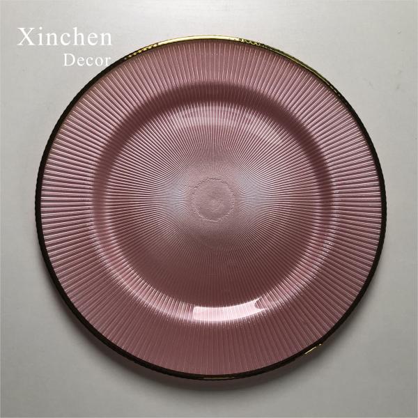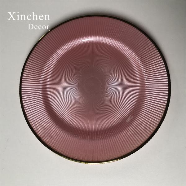 Wholesale luxury golden edge pink stripe rounded glass charger plates for weddings