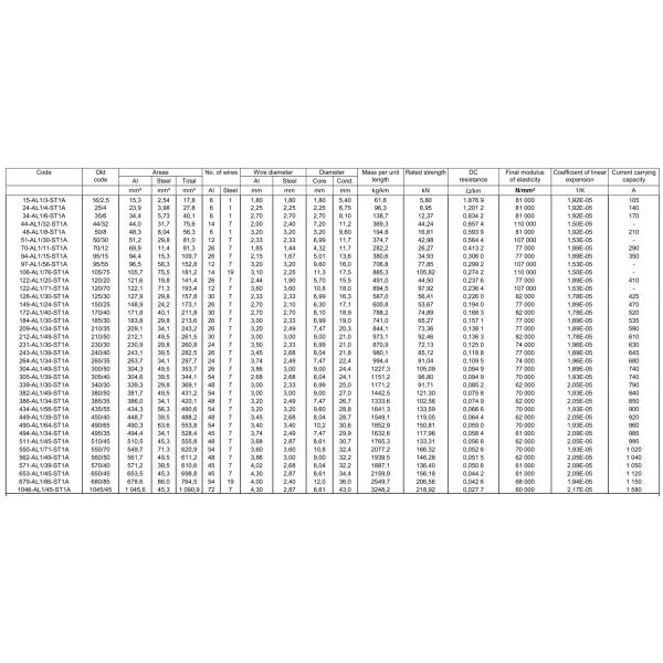 | Code | Old Code | Area | No. of Wires | Wire Diameter | Diameter | Mass per Unit | Rated Strength | DC Resistance | |||||