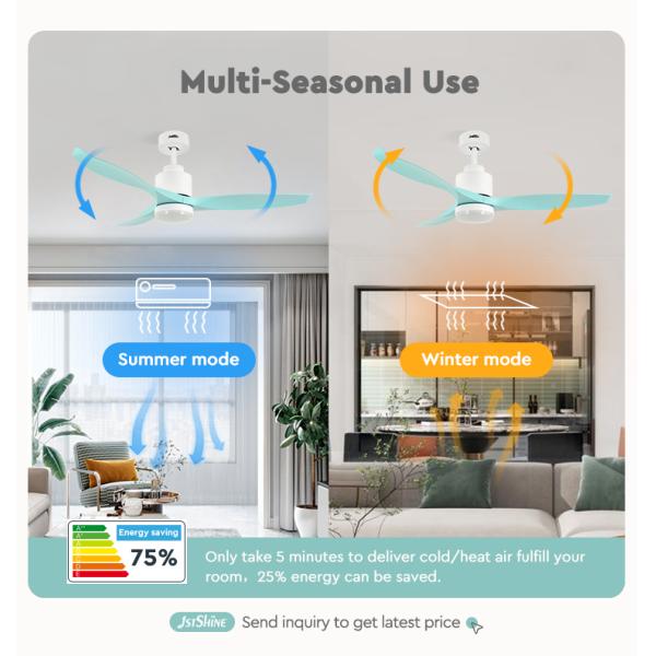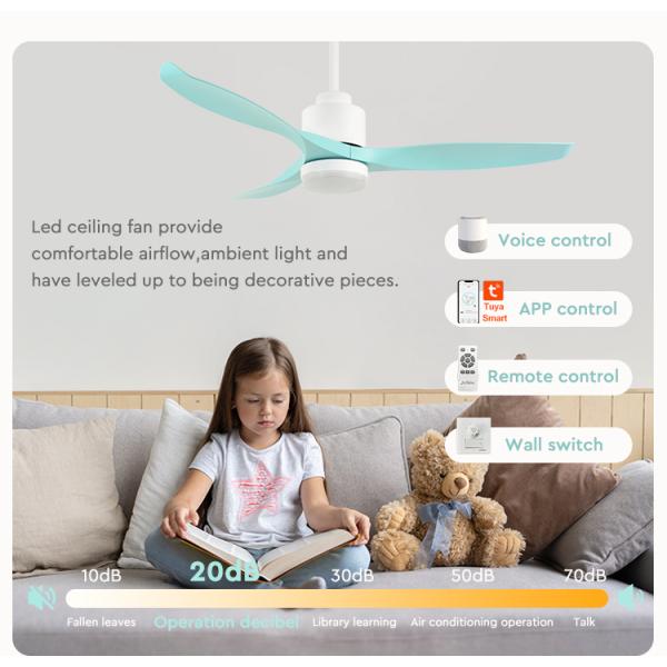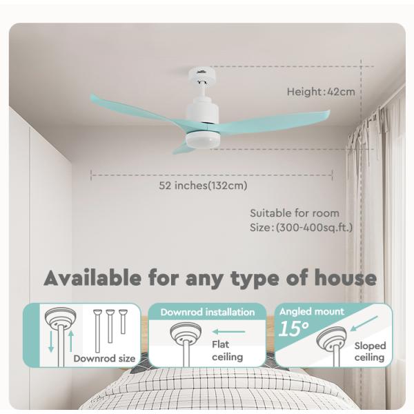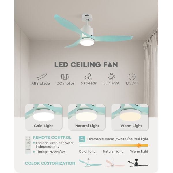 This 52-inch ceiling fan with a dimming light feature. It boasts a modern design and is equipped with 3 green plastic blades. The fan includes a DC (direct current) motor, known for its energy efficiency and quieter operation compared to traditional AC motors. The fan also features a built-in dimming light, allowing you to adjust the brightness according to your preference and the desired ambiance in the room. With the combination of the fan and the dimming light, this product offers both efficient cooling and customizable lighting options. The green plastic blades add a unique and stylish element to the fan, making it a visually appealing addition to any modern living space. Overall, this 52-inch ceiling fan with a dimming light and green plastic blades offers a blend of functionality, versatility, and contemporary design, making it an excellent choice for enhancing the comfort and aesthetics of your home.