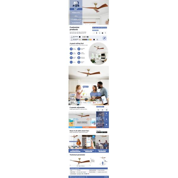 To Retail buyer: Q:How to Pick out a Ceiling Fan? A:If you're thinking about adding a ceiling fan to your space, you’ll want to consider the right style and size for the room. Additional things to consider include light fixtures and remote controls. Q:How do I install a ceiling fan? A:Installing a ceiling fan is a task that most homeowners can accomplish. If you're unsure whether or not you can do the job, hire an electrician to come and handle it for you. If you decide to take on the project yourself, be sure to follow the manufacturer's instructions closely. One of the most important things you should remember is turning off your home's power supply before you get started. Q:What length down rod should be used with a ceiling fan? A:For optimum performance, ceiling fan blades should be at least 2.4 m from the floor but no higher than 2.8 m in order to best cool a room. Q:Are There Smart Ceiling Fans? A:Yes and they can either work with Apple’s HomeKit smart home series, Google Assistant or Amazon’s Alexa. The smart ceiling fans allow you access to smart-home functions, where they can be controlled remotely, or automated to be turned on based on the preset temperature or schedules. They can be linked up with existing smart home devices like Homekit or Alexa. To Wholesale buyer: Q:How quickly would we get a sample from u? Charges? A:Normal items are equal charge within 5-7 days . New development samples are double charge within 15-30 days. All sample fees will be returned to customer when place bulk order. Q:What is the quality of the ceiling fan light? A: Our main products have got CE,CB, ETL,ROHS, REACH,SAA, KC...certificate. Q:How to get ceiling fan specification? E-Catalogue and Quotation? A: Please contact us via email or ablibaba online talk for more information. Thank you!