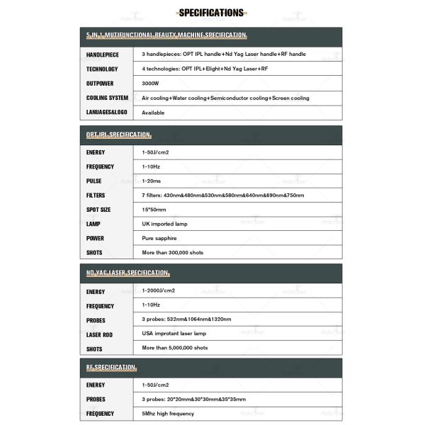 | Technologies: | 4 Technologies: OPT IPL+ Elight+Nd Yag Laser+RF |