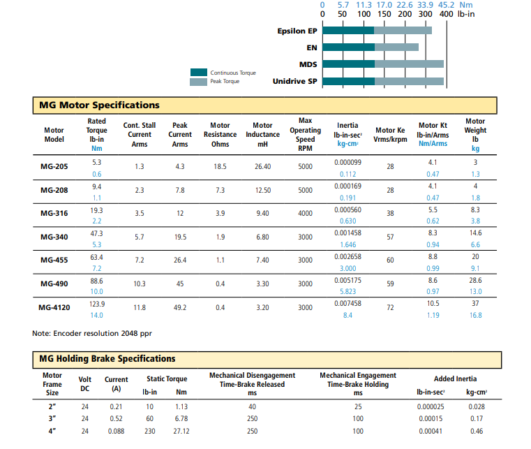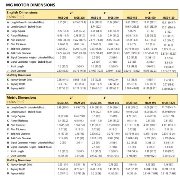 The MG Motor is low inertia motor that is ideally suited for dynamic applications with torque requirements between 5 lb-in (0.57 Nm) and 163 lb-in (18.4 Nm). MG motors use Neodymium magnets to achieve a high torque to inertia ratio giving them a size advantage when compared to competitors‘ motors. MG motors are available in English (NEMA 23, 34, or 56) and Metric (IEC-72-1) flanges with or without brakes. The standard encoder resolution is 2048 lines per rev. MG motors come standard with MS style connectors. All models are rated IP65.