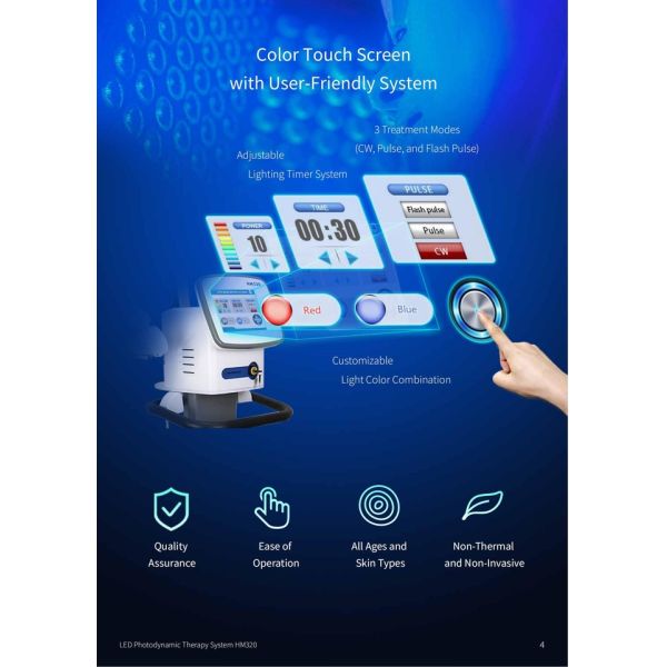 The HM-320 LED photodynamic therapy system is a state-of-the-art solution for skin care. It uses imported, high-quality LED bulbs from the US that produce a narrow-spectrum of red and blue light. The system's LEDs are versatile and emit wavelengths tailored to treat various skin conditions, including enhancing cell activity, breaking down melanin, stimulating collagen production, and aiding in bacterial elimination by white blood cells. It results in comprehensive skin treatment, leaving skin looking healthier and younger.