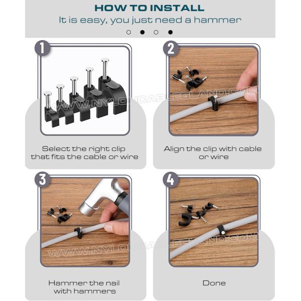 Cable clips with concrete steel nails (cable clamps) are used to secure and organize long wires or cables to a surface, keep cables tidy and organized, protecting cables from damage and avoiding trip hazards. Normally they are available in PE (Polyethylen) material, different colors and various sizes to accommodate different types and quantities of wires or cables. Cable clips are typically designed as small, sturdy devices that can be attached to a surface such as a wall, desk, or other structures. They have a central channel or opening where the cable can be inserted.