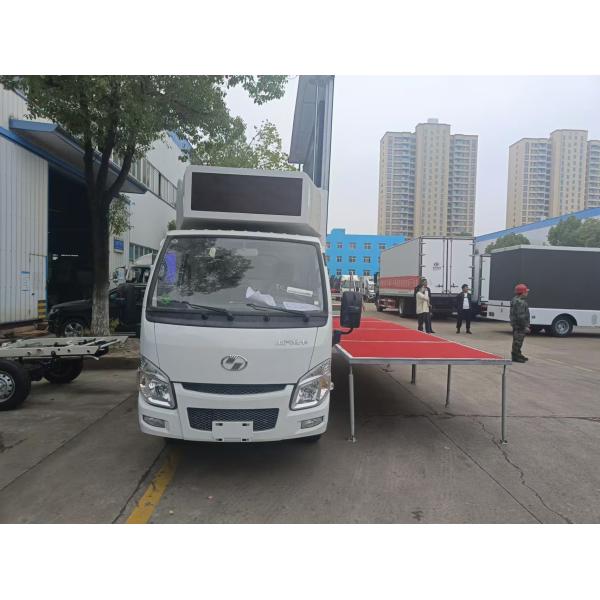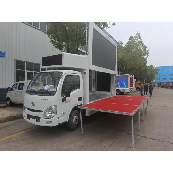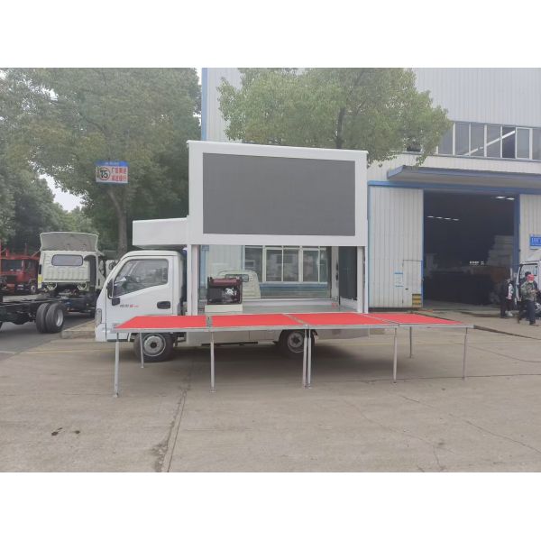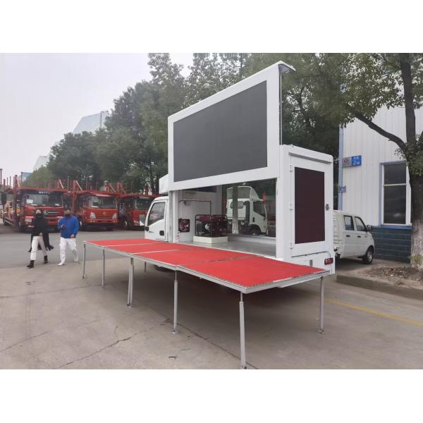 | Standard configuration | (1) Left/right/rear side are full color P6 screen. (2) Front is single red screen. (3) Equipped with 8KW silent gasoline generator. (4) Industrial control computer 1set, amplifiers 1set, waterproof column loudspeaker 4set. (5) Internal and external power distribution box. (6) Circulating ventilation cooling system. (7) Van body roof with exhaust skylight and light. (8) The truck body material is composite steel frame. (9) Interior floor is aluminum checkered plate. (10) Left side screen could lift up. | ||
