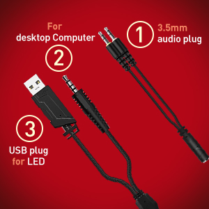 The 3.5mm audio plug is compatible with most devices. The 1-to-2 3.5mm jack splitter cable is for PC. The USB plug is only used for LED light. The braided cable made out of durable material is very strong and resists tangling.
