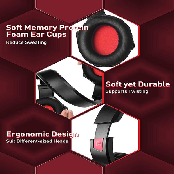 The adjustable headband can fit different sizes of the heads, and the light-weight material is fit completely around your ears and won’t overheat your head. What’s more, the soft headband without a built-in steel strip is durable and strong enough for long-term use. Your gaming headset will not break up even twisting it over 180°.