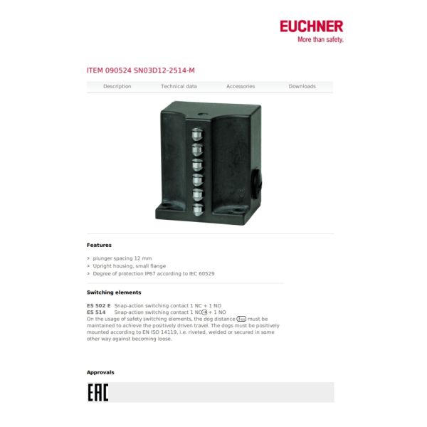 Buy Upright EUCHNER SN03D12-2514-M Order no. 090524 Solenoid Valve with IP67 Protection and Performance at wholesale prices