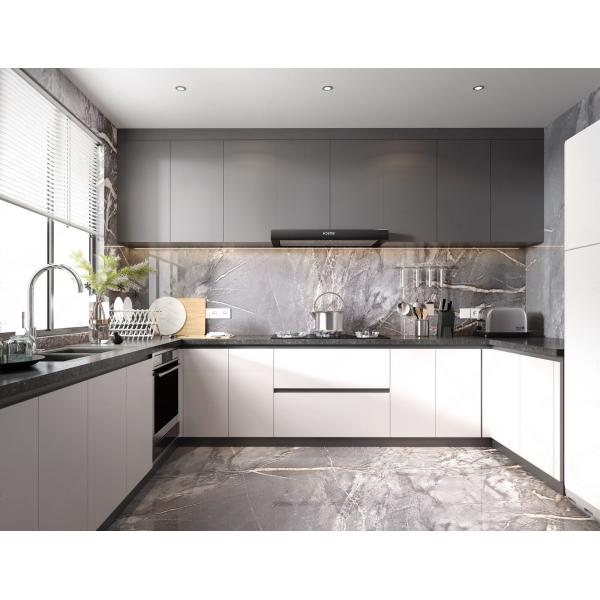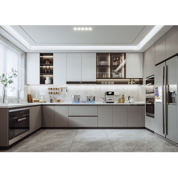 The carcass of the kitchen cabinet is made with particle board, plywood, MDF, OSB, or HMR, depending on the customer's preference. These materials provide a sturdy foundation for the kitchen cabinet and ensure that it will withstand daily wear and tear.
