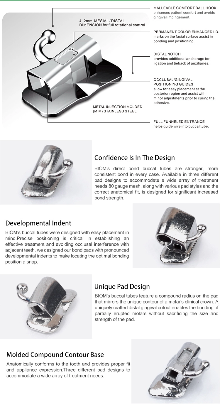 | Types Of Orthodontic Molar Buccal Tube | 1,First Molar Tube, Second Molar Tube 2,Edgewise Tube, Roth Tube,Mbt Tube 3,Convertible tube, Non-convertibe buccal tube 4,Weldable Tube( Smooth Base), Bondable Tube ( Mesh Base) |