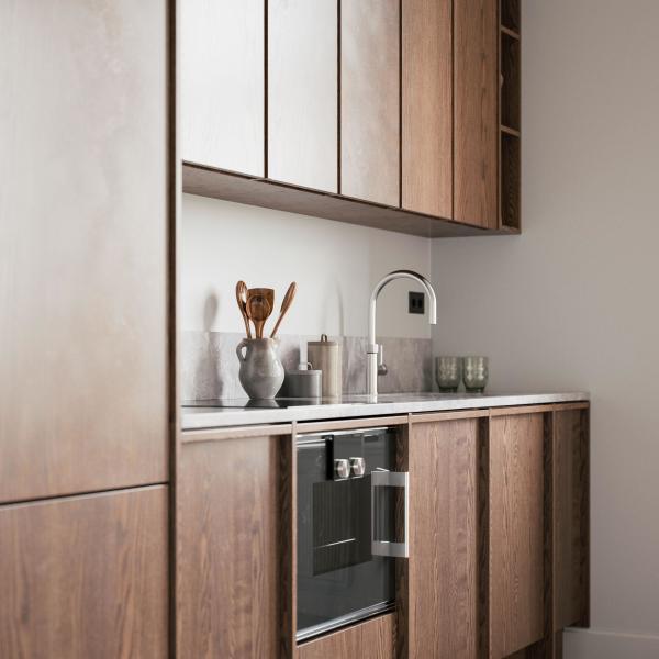 - Material: For modern apartments, quartz, granite, or sintered stone countertops are ideal, offering durability, low maintenance, and a modern aesthetic. You can choose white, gray, or black to contrast with the wood veneer cabinets.