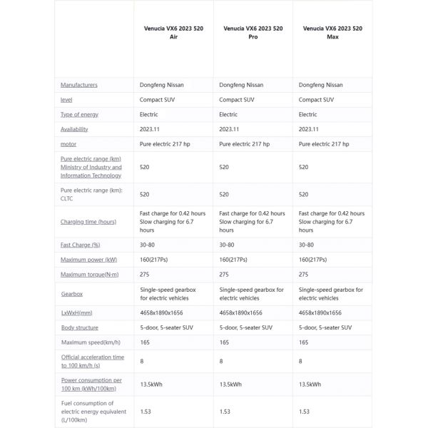 In terms of power, the Venucia VX6 will provide a pure electric version, and is equipped with lithium iron phosphate battery, the maximum power of the motor is 160kW, and the maximum speed is 165km/h.