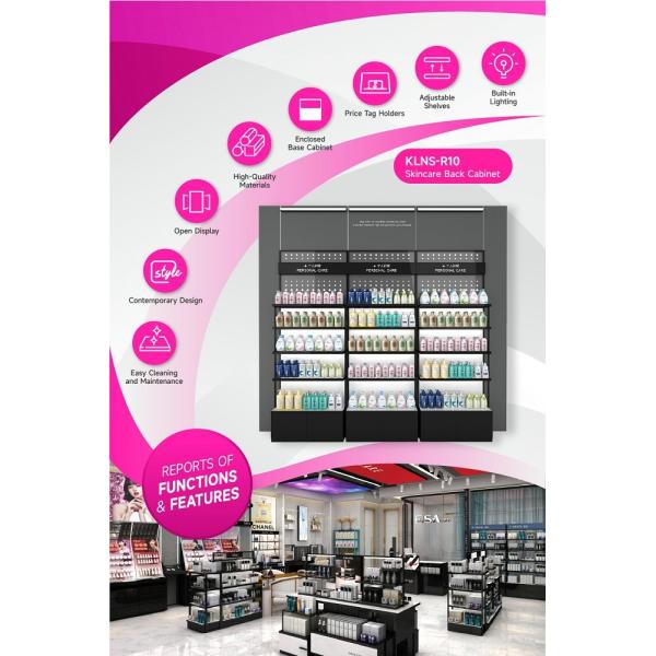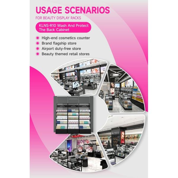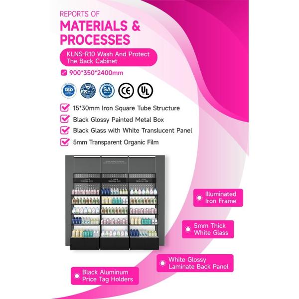 White LED light strips are hidden under the shelves, and a 40mm thick soft film lightbox is installed at the top to ensure bright product displays.
