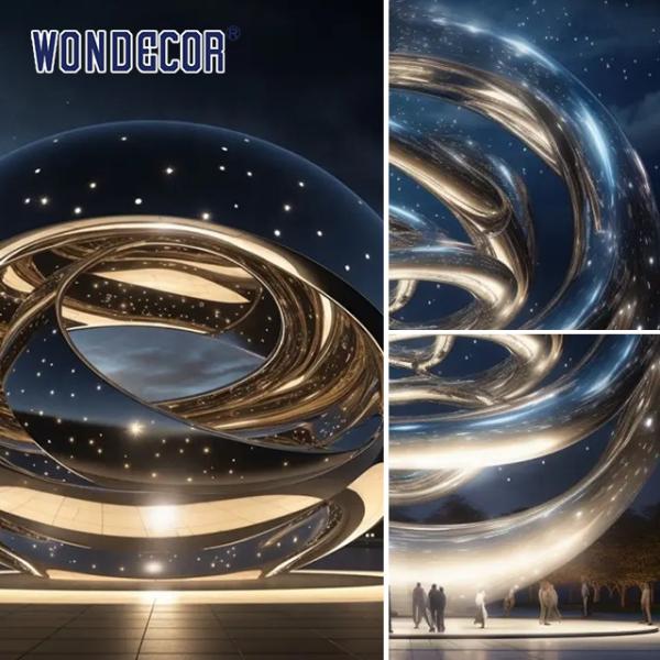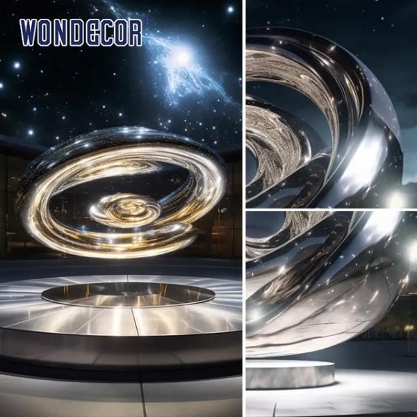 The outdoor metal art twisted star ring stainless steel sculpture, with its unique charm and multiple significant advantages, has become a beautiful scenery in modern urban public spaces. Crafted with high-quality stainless steel material, this material not only has excellent corrosion resistance and weathering resistance, ensuring the stability of the sculpture's form and long-lasting bright color under outdoor changing climate conditions, but also endows the sculpture with lightness and structural strength, making it easy to install and display in different environments. Whether it is urban squares, parks and green spaces, or commercial districts, it can become the focus of attention, enhancing the overall artistic atmosphere and cultural taste of the environment. The design inspiration for the twisted star ring comes from the trajectory of galaxies in the vast universe. Through modern metal processing technology, traditional aesthetics and modern technology are perfectly integrated to form a visual experience that is both abstract and profound. The distortion and curvature of the sculpture surface not only showcase the mystery and unfathomability of the universe, but also give the work a sense of dynamism and vitality, bringing infinite imagination to viewers. In addition, the surface of stainless steel sculptures is smooth and not prone to dust accumulation, making daily cleaning and maintenance simple and fast, greatly reducing maintenance costs. Even if professional maintenance is occasionally required, its good material properties make maintenance work easier and more efficient. More importantly, stainless steel, as a recyclable material, conforms to the current sustainable development concept of green and environmental protection. Choosing stainless steel sculpture is not only a pursuit of artistic aesthetics, but also a contribution to environmental protection, demonstrating the harmonious coexistence of art and nature. In summary, outdoor metal art twisted star ring stainless steel sculptures have become an indispensable artistic element in modern urban beautification and cultural heritage due to their excellent durability, unique aesthetic value, wide environmental adaptability, low maintenance costs, and sustainable development characteristics.