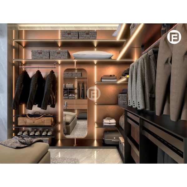 The Fadior Rose Gold Stainless Steel Walk-In Closet is the epitome of luxury and functionality. Crafted with high-grade stainless steel featuring a unique rose gold cross-grain finish, this U-shaped closet maximizes storage with its multi-hanging zones and custom-designed compartments. The integrated LED light strips highlight every corner, adding a modern and sophisticated touch to your wardrobe organization. Fadior’s innovative use of stainless steel ensures durability, elegance, and versatility, making it the ideal choice for full-house customization.