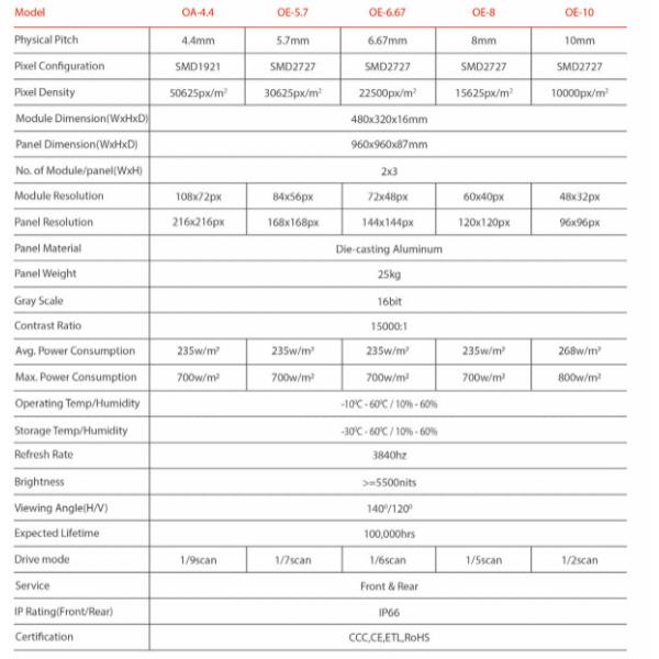 OA series is a kind of high brightness outdoor LED display designed by common cathoded, which is suitable for outdoor fixed installation. Its main feature is that it can support the ultra-high brightness of up to 10000 nits. It has excellent high temperature resistance and high flame retardant performance. In addition, it can save 50% of power and energy consumption.