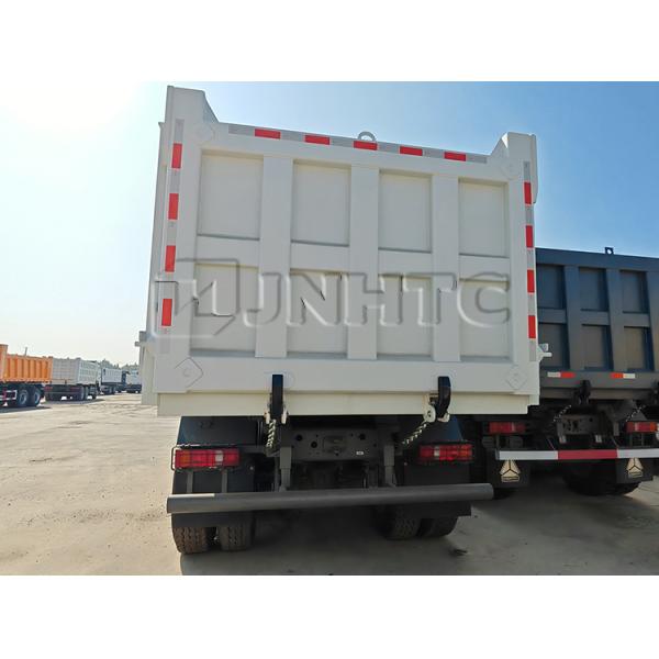 Hydraulic Lift System: The dump bed is raised by a hydraulic lift system, allowing materials to slide out of the back. This hydraulic mechanism is essential for quick unloading, as it tilts the bed upwards, guiding the material toward the rear exit.