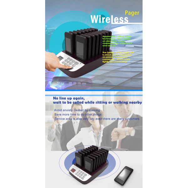 4.Guest get the wireless signal by pager viabrating or LED flashing or DIDI with his or her number, and go to the front to take his or her order.