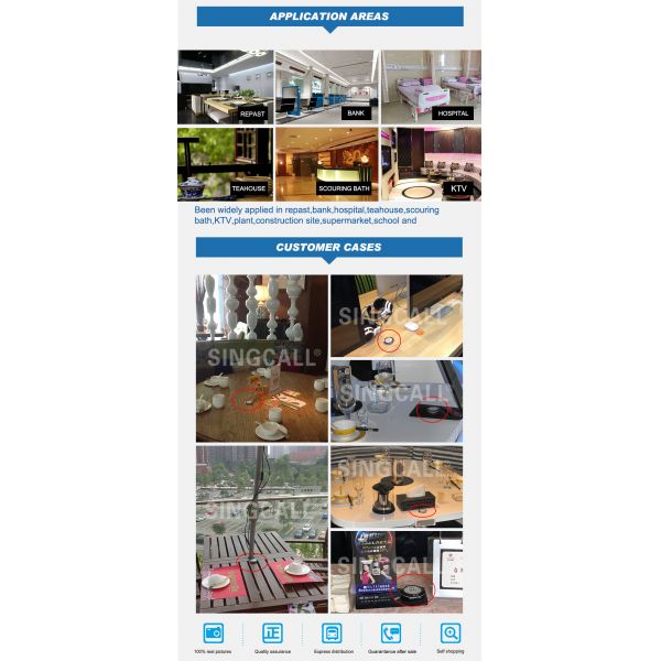 wireless watch paging system is widely used in service area. It consist of table button for guest use and signal receiver watch pager for waiter or waitress use. When the guest needs any service, he or she just press the button near him or her, his or her desk number will showing on the watch pager with alert music or sound. So the waiters could offer service very timely.