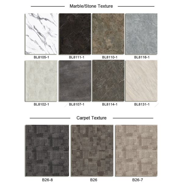 Name | SPC flooring | Patterns | Stone, Marble, Carpet, Wood Grain |