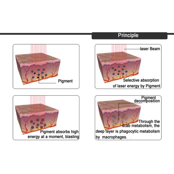 Laser emitted by the system has a strong penetration ability which allows it to reach the deep layer of dermis. The pigment particles absorb the light energy and explode sharply, burst into the tiny pieces, thus diminish the color density and get rid of it. So the appliance can effectively do away with mutant pigmentations and vascular tissue based on undamaged ambient tissue. This is called ‘Selective heat absorption’ principle in medical field.
