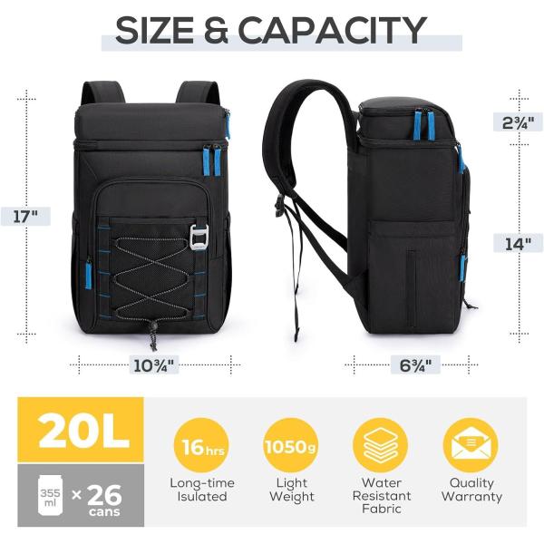 The inner insulation of the backpack cooler is thickened with 10-8mm(others 5mm) foam and the leak proof EVA liner works together to keep food and drinks cold up to 16 hours.