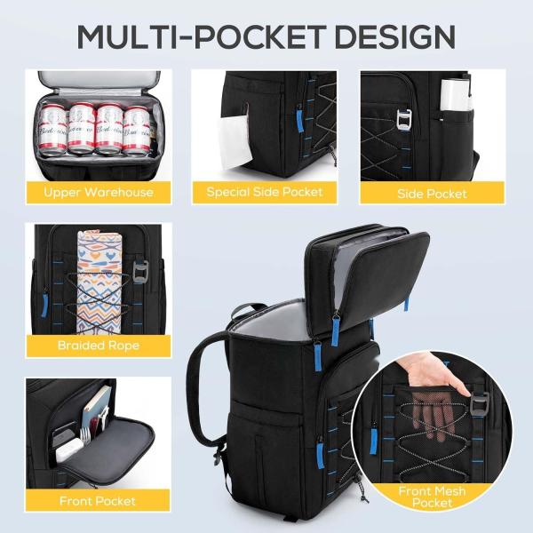The backpack cooler includes 1 main large insulated leak proof storage compartment for drinks, 1 upper compartment used to organize dry items, 1 front zipper pocket that comes with a mesh pocket and braided cord for accessories. 2 side pockets, one for holding tissues and the other for holding objects such as umbrellas.