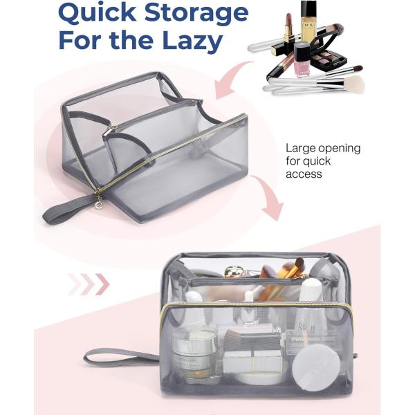 Makeup bags for women are crafted from durable mesh material, that is not only durable but also easy to clean. The sturdy handle makes it easy to carry, while the double-way zippers and bottom tabs provide convenient access and smooth pulling of the makeup case