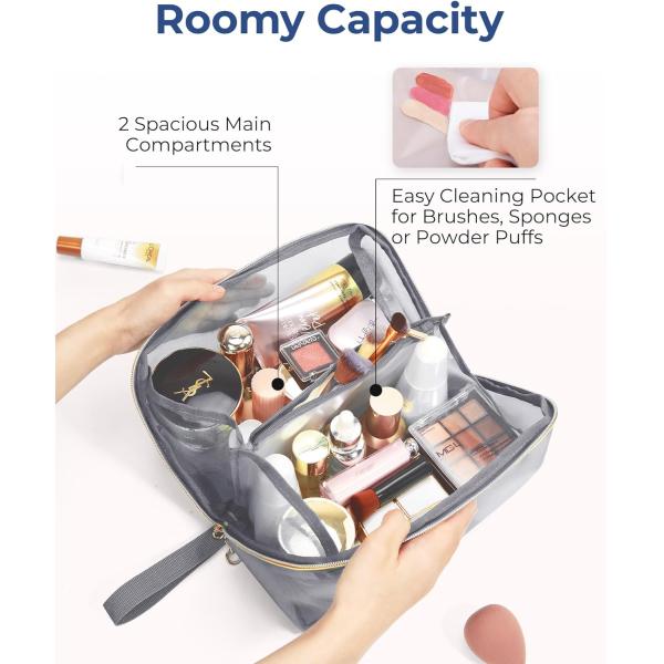 Wide-open full wraparound zippered makeup bag makes it easy to find and reach your daily cosmetics, skin-care products, and toiletry accessories. Open up completely, and just pull the zippers for easy storage and viewing of contents