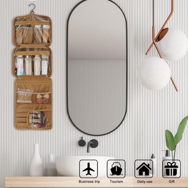 2 PVC zipper pockets are transparent and waterproof, you can store your items easily. Internal elastic straps and pockets help toiletries stand upright and avoid spills; toothbrush area/brush area with PVC cover piece for wet and dry separation.