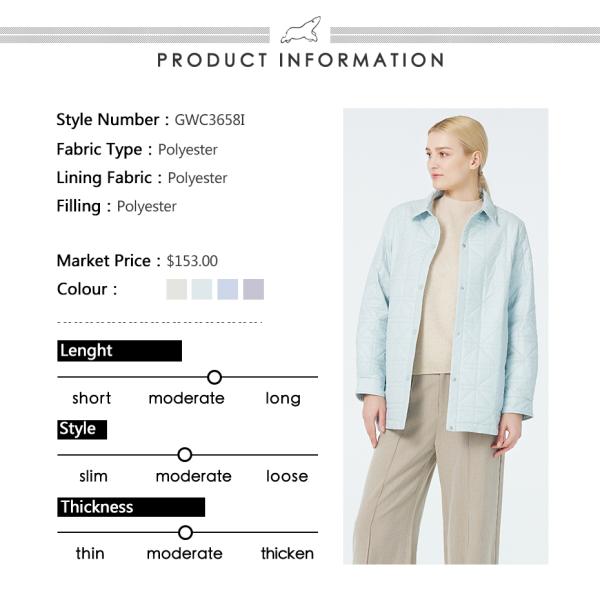 The filling is made of polyester, ensuring warmth on chilly days. The lapel design is simple and elegant, enhancing the facial shape and adding a touch of classic elegance. It's fashionable and versatile, easily pairing with various outfits. The slant pocket design is not only practical, convenient for storing small items, but also adds a sense of symmetry and beauty to the overall design.