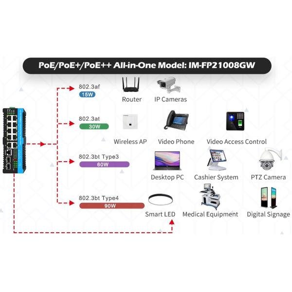 | Port | 2*100/1000/2500Mpbs SFP ports SM: 1310nm/1550nm, 20Km; 1490nm/1550nm, 40~120Km MM: 1310nm, 2Km; 850nm, 500-meter 10*100/1000M UTP RJ45 Uplink(Support MDI/MDIX auto-sensing) 8*UTP PoE Downlink(PoE af/at/bt) 1*Console port 1*6-PIN power terminal block 2*Alarm output |