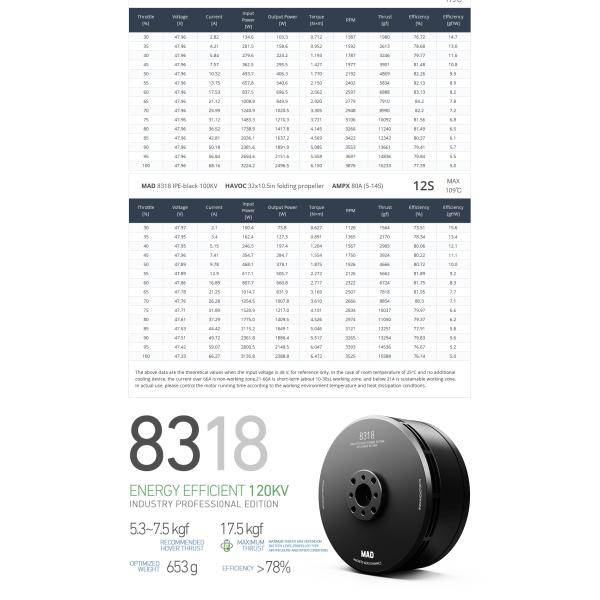 The 8318 brushless motor was designed for heavy agricultural lifting. harsh environments while maintaining high efficiency and load capacity. It has a long lifespan and is IP35 water and dust resistant. With a maximum thrust of 17.5kg and a prop size of 28-32in, it is a reliable choice for agricultural use. Agricultural drones widely use it because of its high performance and cost-effectiveness.