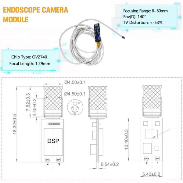 2MP 5mm OV2740 Micro USB Endoscope Module 140°FOV 80mm DOV. This endoscope has a very small diameter of 5mm, equipped with a 1/6" OV2740 sensor, HD 1080P 2MP, 1920*1080 resolution, can output high-quality images, and is waterproof and oil-proof, reaching IP67 level.