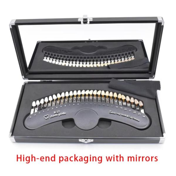 This color chart is divided into 27 color levels, which is more simple and clear, easy to use, easy to clearly record and observe the changes in the color of your teeth, and provides a refined aluminum box packaging with a mirror.