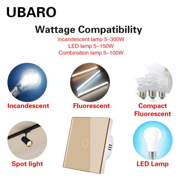 This touch switch is equipped with a tactile sensor that uses a push-button switch to operate. It has a power rating of 5-300W/gang, and is made with a tempered glass panel that not only looks sleek and modern, but also provides durability to the product. Additionally, it is fireproof with a 94-Vo rating, ensuring safety and reliability.