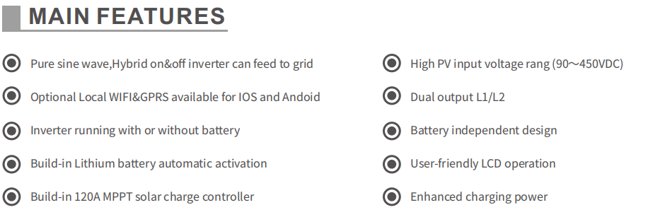 | Max. PV Power: | 4.2KVA Model: 5000W 6.2KVA Model: 6500W |
