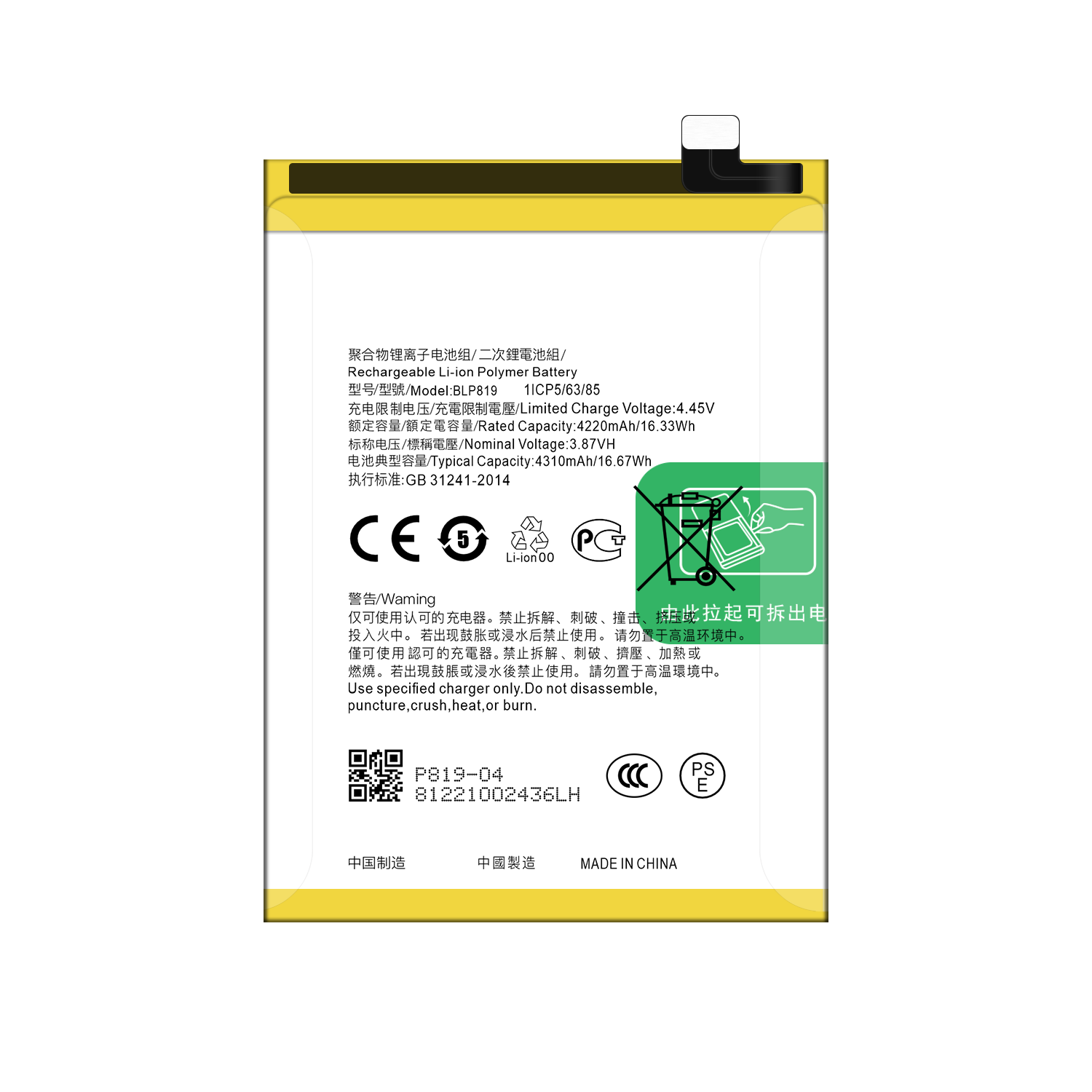Introducing the Rechargeable Li-Polymer Battery BLP819, specifically designed for the OPPO Reno 5 (4G) and Reno 6 Z. With an impressive capacity of 4310mAh and a voltage of 3.87V, this battery ensures your device runs smoothly throughout the day.