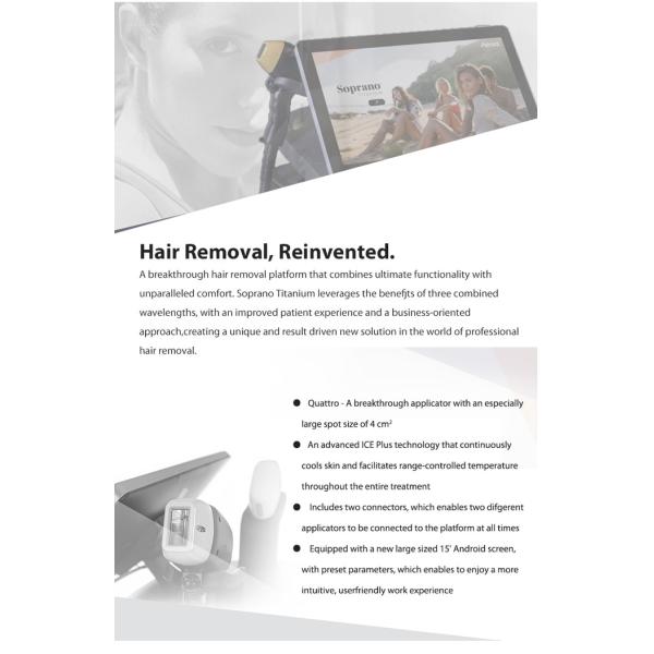 Introducing Soprano Titanium, a revolutionary hair removal platform that offers unparalleled comfort and functionality. By combining three different wavelengths, Soprano Titanium offers a unique, customizable hair removal experience that is both efficient and effective. Whether you are a professional salon owner or an individual seeking to remove unwanted hair, Soprano Titanium is a powerful tool to have in your arsenal.