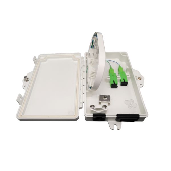 In order to provide better fiber management, the wall mount has been integrated with a fiber cassette and adapter plate. It can support up to 2 SC/LC duplex adapters, 2 sleeve slots, and 1 slot for a PLC splitter tube. Additionally, the wall mount is made from high-quality ABS+PC engineering plastic which is reinforced by strength strips on the lid, making it very sturdy.