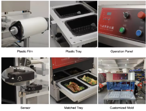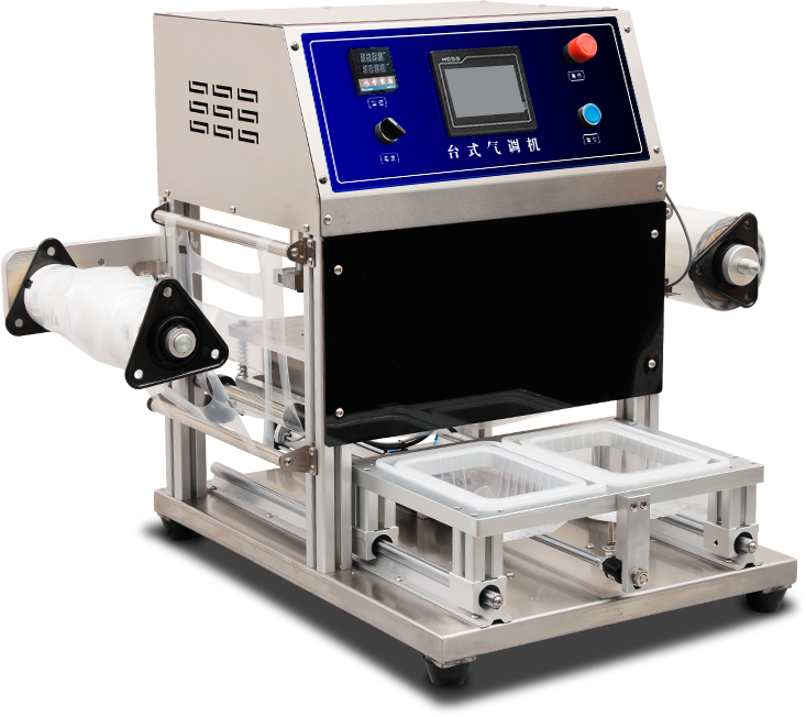 Designed specifically for bigger tray sizes and heavier food items such as ready-made meals, instant food, marinated meats, and raw meat, this machine is highly versatile and efficient. It is suitable for the packaging of a wide variety of foods, including raw and cooked meats, seafood, dairy products, fruits, vegetables, rice, and flour-based foods.