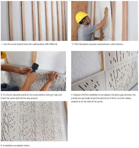 Step 3:Fix the art acoustic panel on the wood battens with gun nails,and insert the wooden slat into the side groove.