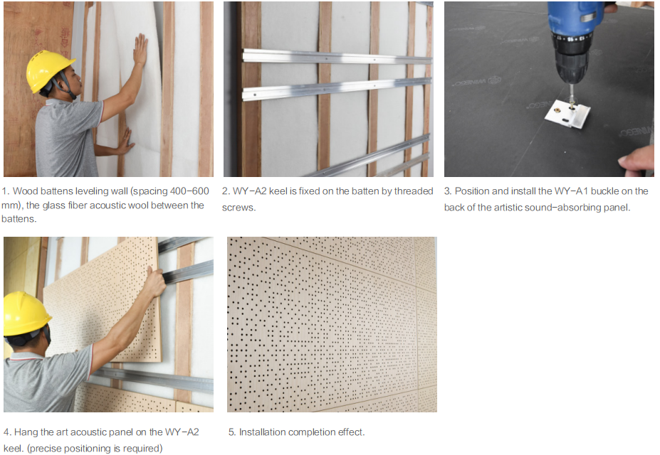 Step 1: Wood battens leveling wall (spacing 400-600mm),the glass fiber acoustic wool between the battens.